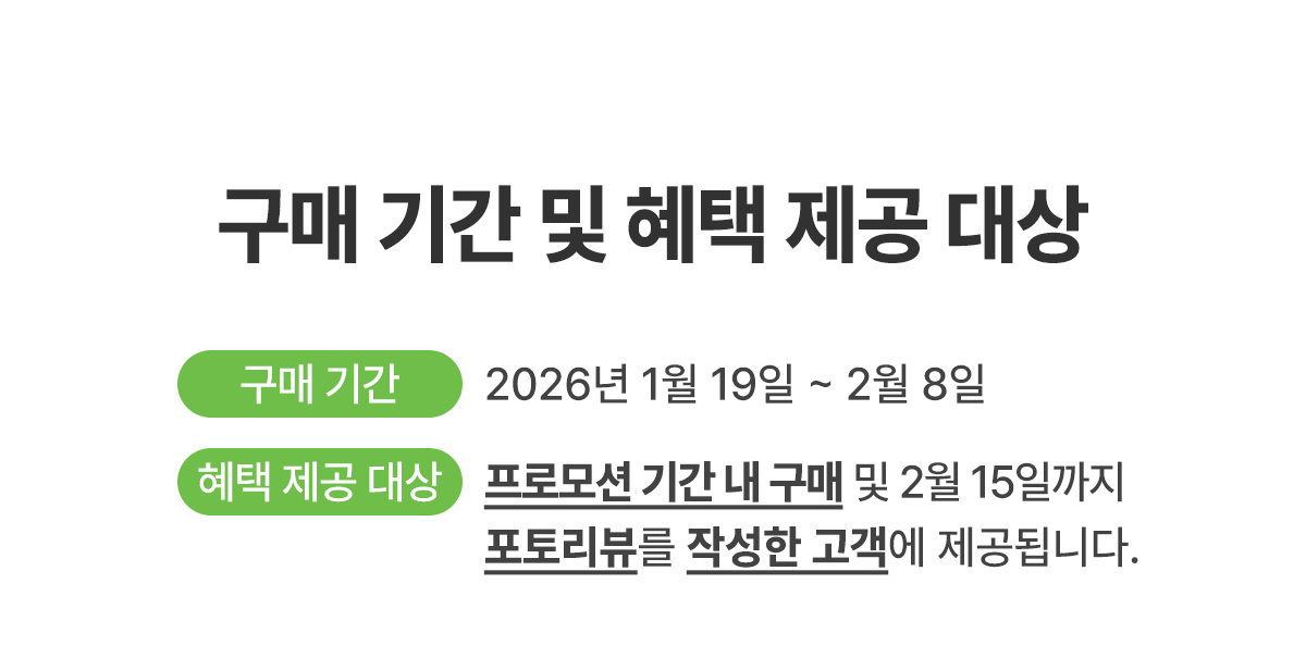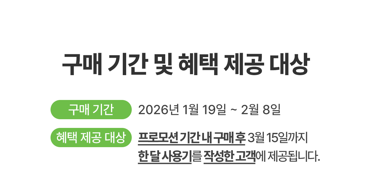 • 제품 구매 인증 이벤트 / 포토 구매평 이벤트 / 한 달 사용기 이벤트는 2월 8일까지 구매한 고객을 대상으로 진행됩니다.