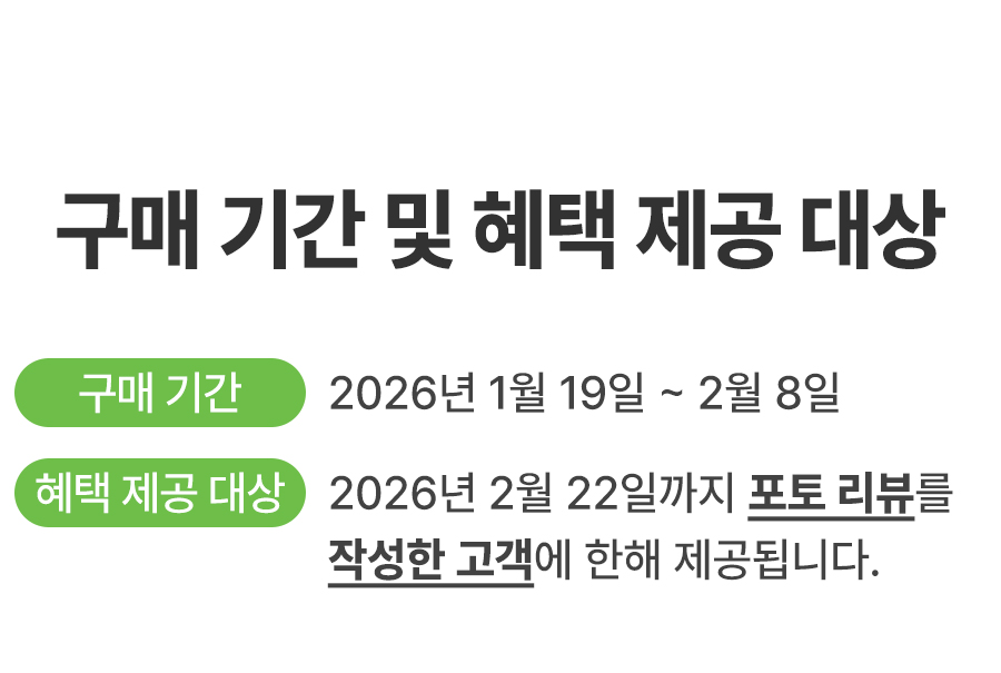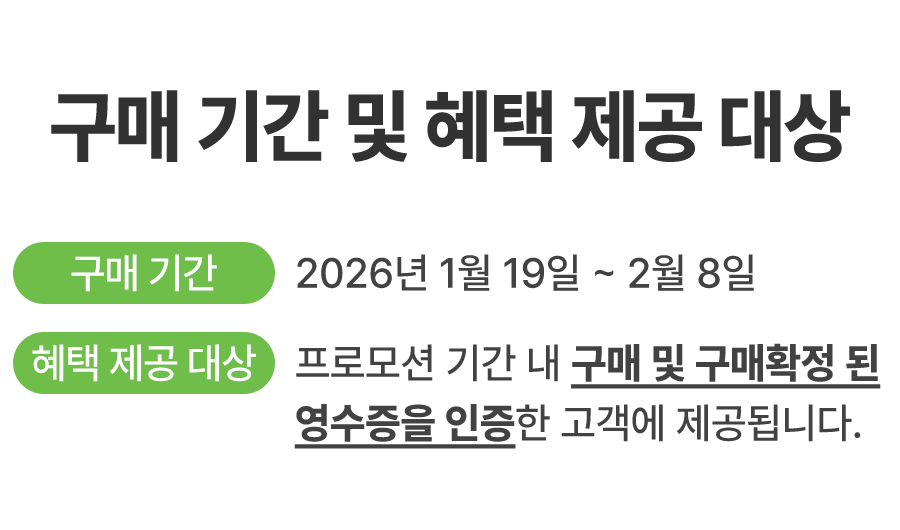 • 구매 후기 이벤트는 구매 수량 기준으로 적용되며, 구매 수량을 확인할 수 있는 영수증을 인증해야합니다.